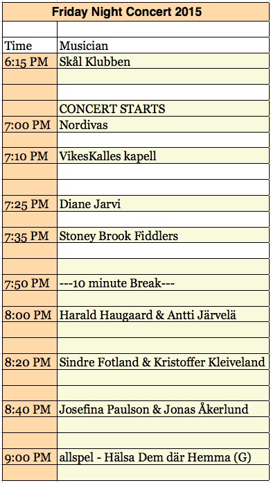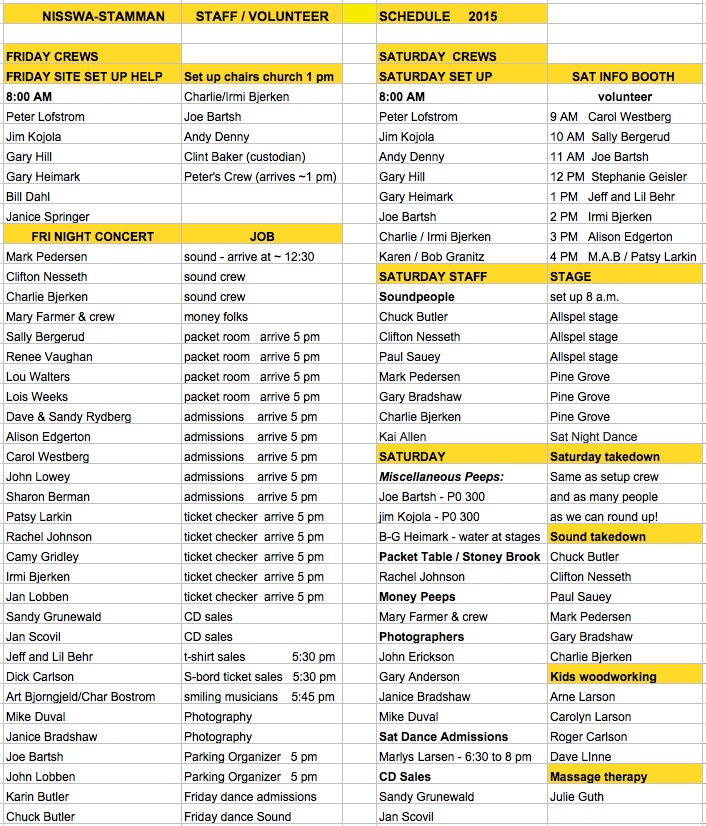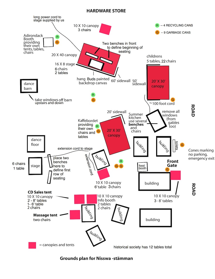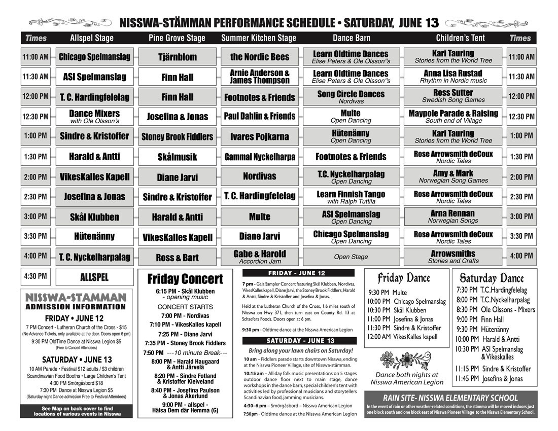 1. Nisswa program performing schedule 2. Dance schedules Friday night and Saturday night schedules 3. Festival map See the layout of the Pioneer Village and note the musician's changing / instrument storage / bathroom location 4. Friday Night Concert and Sound Check