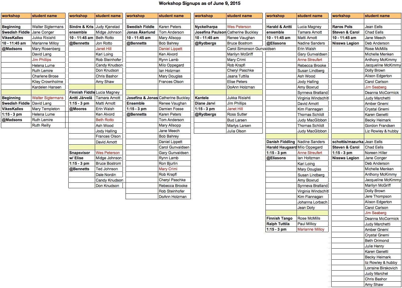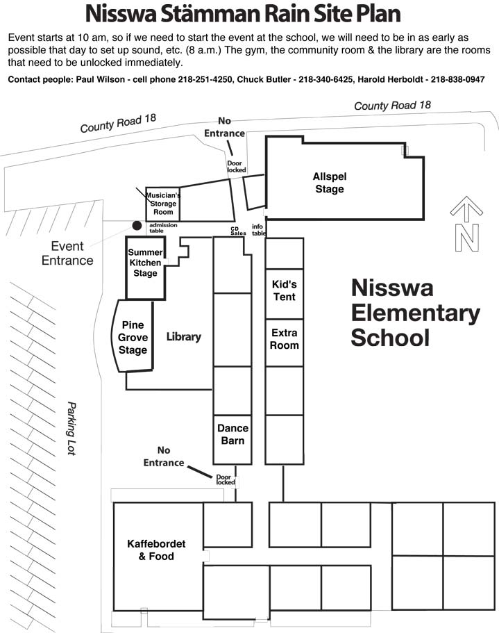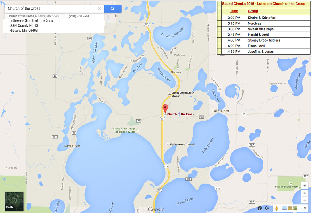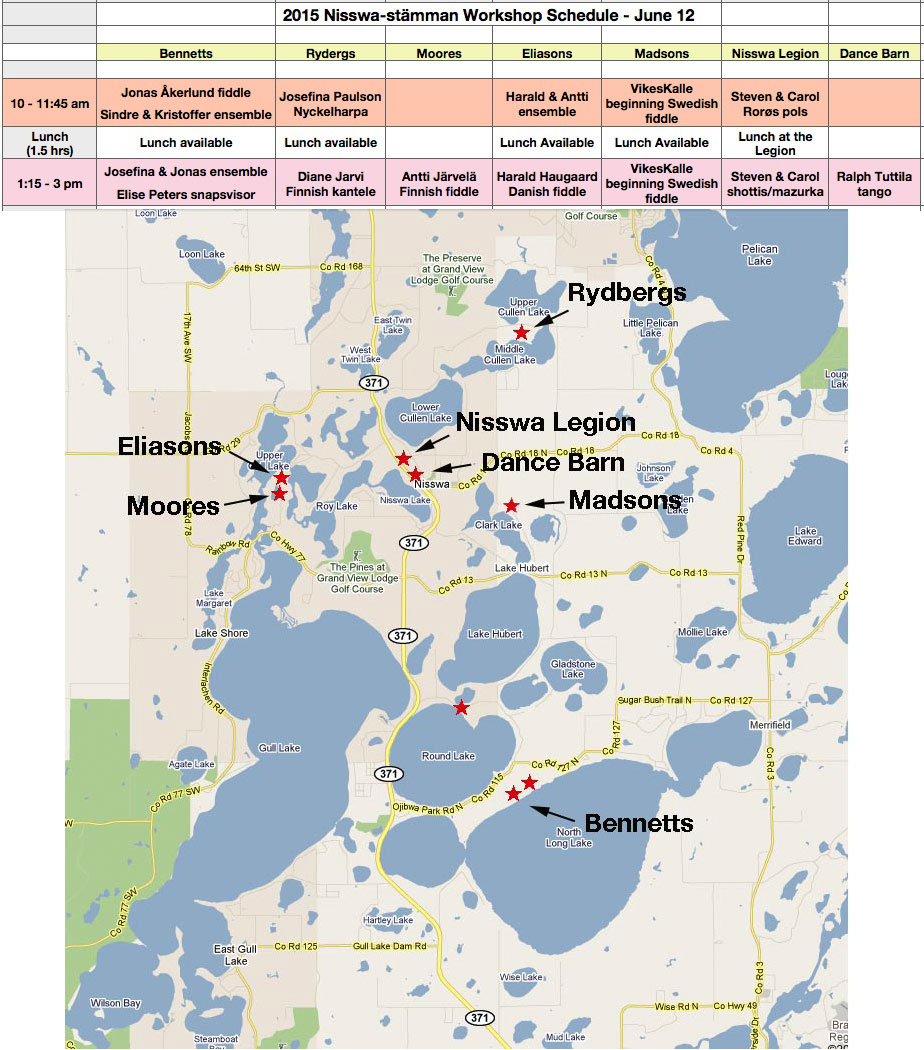 overall map of locations and download pdf maps for each home. 8. Commonly played Allspel tunes help me remember more! 9. First Timers Read this if you haven't performed at Nisswa-stämma before. It gives you a good overview of what happens 10. Rainsite map Read info about the rainsite... Remember we actually may have to do this!!! (once so far in 14 years) 11. Sunday Brunch Sherwood Forest Tavern Info and directions to the great Sunday brunch |