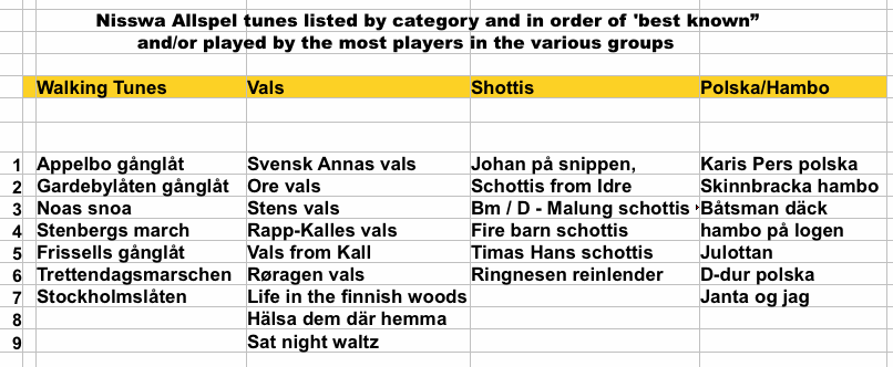 | WALKING TUNES Äppelbo gånglåt Gärdebylåten gånglåt Noas snoa Frisells gånglåt Stenbergs marsch Stockholmslåten Trettondedagsmarschen WALTZ Svensk Annas Vals Vals from Kall Ore vals Balzer Jungfrun (alvdalens waltz) Chicago vals Hälsa dem där hemma Kärleksvalsen Life in the finnish woods Rapp-Kalles vals Røragen vals Sat night waltz Skåne vals Stens vals |
