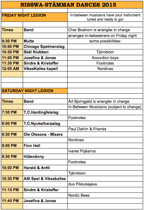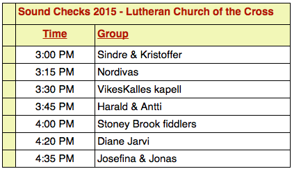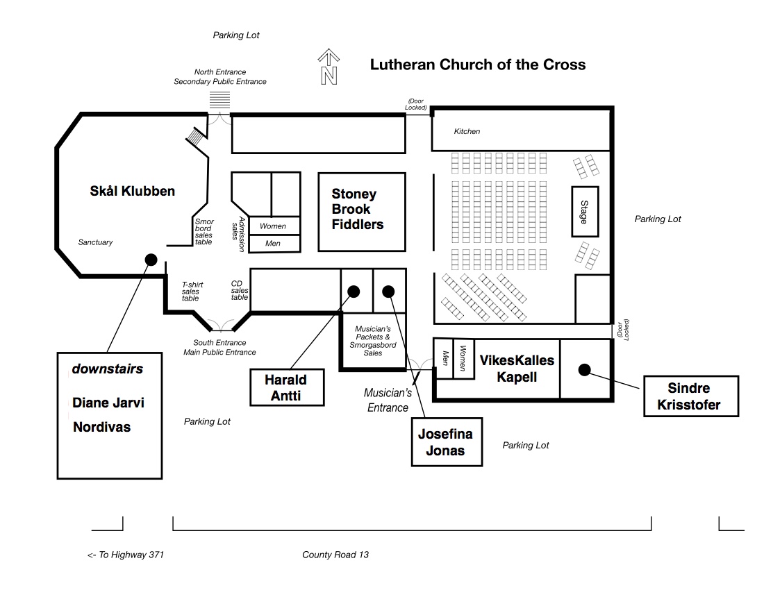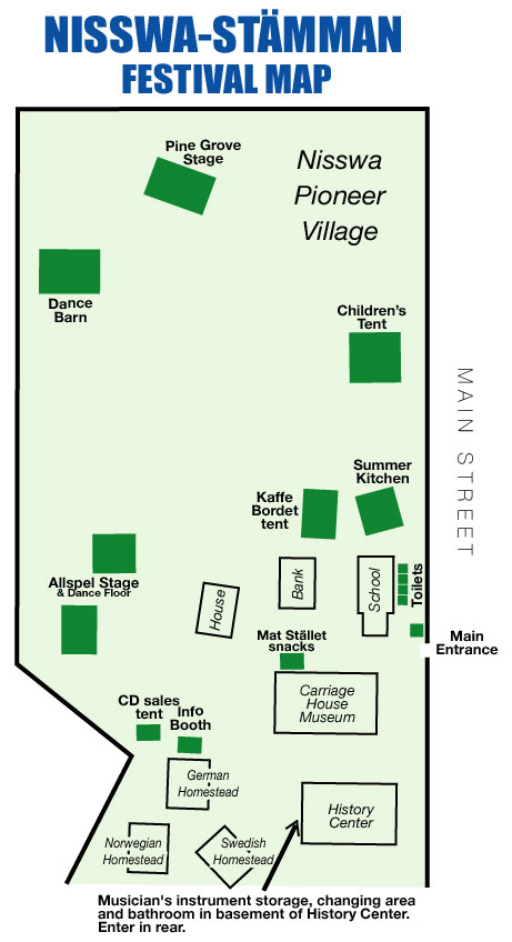 reference later, when you will actually need it! Friday night is the opening concert at the Lutheran Church of the Cross. For those of you involved in the concert, you will want to arrive by 6 pm or so. We have volunteers staffing a "musician's packet room". Go to the room and pick up your performers packet. If you ordered any extra smorgasbord tickets, you should pay for them at that time. You will also need to get your wristband there. We will have rooms available for warming up. Our local spelmanslag, Skal Klubben plays warm up music for about 45 minutes before the concert begins. All of the performers for the evening sit in chairs set on either side of the stage, facing the audience. Try to be in these chairs by 6:50 pm so we can start promptly. Remember that we are on a very tight schedule Friday night, so only take the amount of time 'alloted' to you in the schedule (see the friday performing schedule listed on this blog page above). Directions to the church (all of these directions are also available on our web site complete with maps) The Lutheran Church of the Cross is 11.6 miles north of the intersection of Hwy 210 and Hwy 371 in Baxter, or1.6 miles south of Nisswa on Hwy 371. Turn east at Schaefers Market (Hwy 371 at County Roads 13 & 77). After the concert is the dance at the Nisswa Legion Club. Even if you don't perform that night, it's a really neat event so you should try to make it! Sat morning, the event begins with a musician's parade which starts from the south end of Nisswa (Nisswa Square) and goes about 4 blocks to the north end of Nisswa, ending at the Pioneer Village. You are all welcome to participate in the parade. Just attach yourself to a group that's walking and playing, or make up your own group. We start marching at approximately 10 am and get to the village by 10:15 am. Then there are a few speeches (very short) and we all play tunes together - an allspel. The allspel finishes about 10:45 or so and then people fan out to the various stages to get ready for the first sets which begin at 11 am. After that, things just go like clockwork all day long...It's important to quit your performance about 7 minutes before the end of your alloted time..be considerate of the group following you. As I mentioned in a previous email, we do have a changing room/instrument storage area on the grounds...see the site map. The stämma ends with another allspel at 4:30 pm...you are all