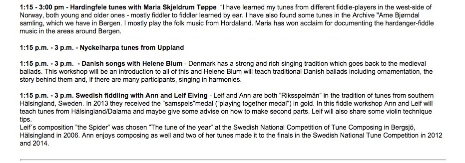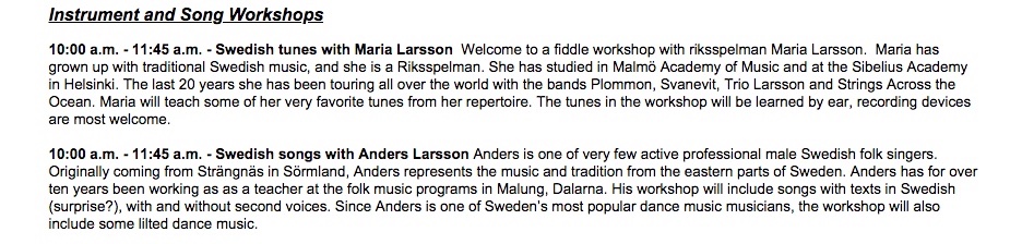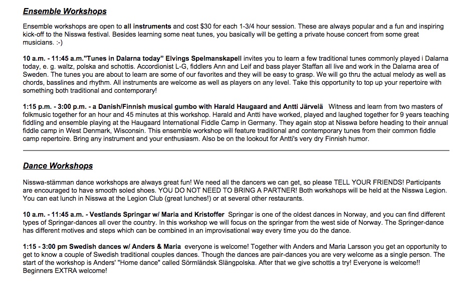 Scandinavian instrumental, singing and dance workshops, featuring top level musicians from Denmark, Sweden, Finland and Norway will take place on June 8, 2018 in and around Nisswa, Mn. You must sign up in advance for these. These workshops are offered in conjunction with Nisswa-stämman Scandinavian Folkmusic Festival, June 8, 9, 2018. Sessions are 1-3/4 hours long. The first one starts at 10 a.m. and ends at 11:45 a.m. The second one starts at 1:15 p.m. and ends at 3 p.m. Cost for the sessions is $30 each. All locations are close enough together so it is possible to drive between them over lunchtime. All workshops are generally taught by ear and participants are encouraged to bring recording devices. For some of the locations a 'spelmans' lunch is offered at 11:45 am, and consists of cold cuts, vegies, fruit, etc and costs an extra $5. (note - no lunch is provided at the dance workshops...but, you can buy lunch right at the Nisswa Legion and/or downtown Nisswa is close with several restaurants available) After you signup you will receive more information about your workshop, including a detailed map for getting there. TO SIGN UP, PLEASE CONTACT JANET HILL - Janet Hill <janethillnew@gmail.com> or call her at 218-259-4090. That’s all you need to do — just give her your name and your workshop choice(s). After you sign up, she’ll send you more information about your workshop, including a detailed map for getting there. It is always possible that we may have trouble filling all the workshops with students. If you know of anyone who may be interested, please pass the word along... think of any scheme you can to get the word out in your community! Thanks! If your chosen workshop is not 'viable' because of a lack of sign-ups, you will either be asked to pick a second choice... OR, you could perhaps negotiate a private lesson with that teacher too. Janet will keep you informed. Workshop locations